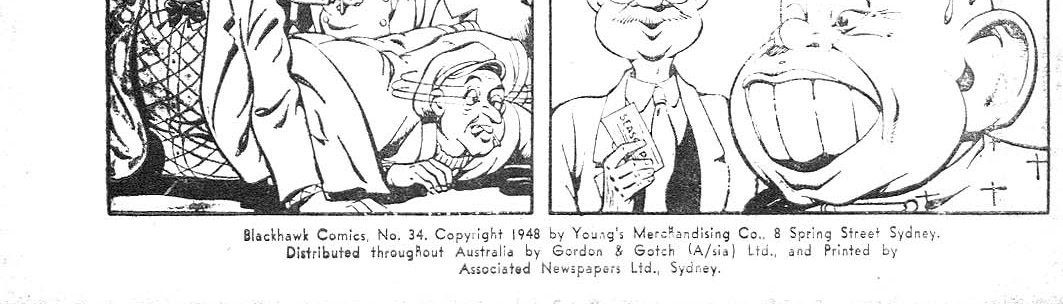 Blackhawk Comics, N. 34. Copyright 1948 by Young's Merchandising Co., 8 Spring Street, Sydney. Distributed throughout Australia by Gordon & Gotch (A/sia) Ltd., and printed by Associated Newspapers Ltd., Sydney.
