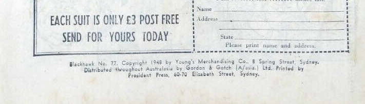 Blackhawk No. 77. Copyright 1948 by Young's Merchandising Co., 8 Spring Street, Sydney. Distributed throughout Australasia by Gordon & Gotch (A/asia.) Ltd. Printed by President Presss, 60-70 Elizabeth Street, Sydney.