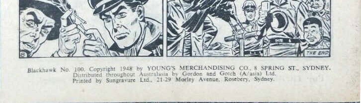 Blackhawk No. 100. Copyright 1948 by Young's Merchandising Co., 8 Spring St., Sydney. Distributed throughout Australasia by Gordon and Gotch (A/sia) Ltd. Printed by Sungravure, 21-29 Morley Avenue, Rosebery, Sydney.