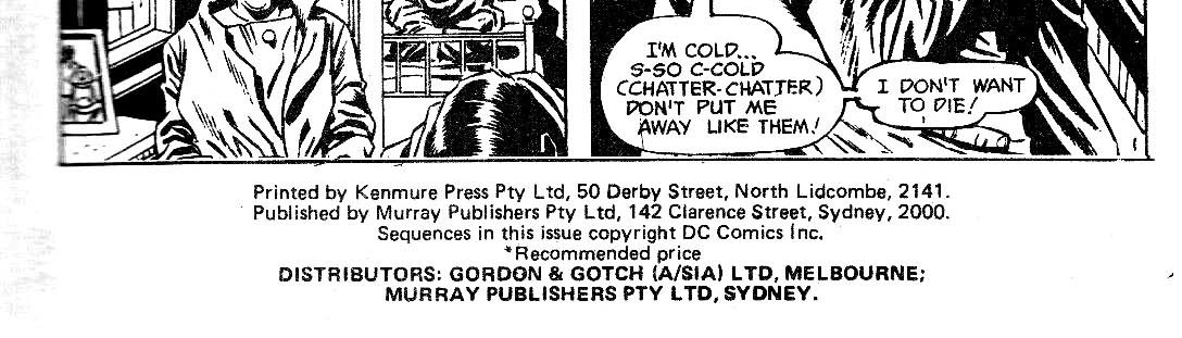 Printed by Kenmure Press Pty Ltd, 50 Derby Street, North Lidcombe, 2141. Published by Murray Publishers Pty Ltd, 142 Clarence Street, Sydney, 2000. Sequences in this issue copyright DC Comics Inc. Distributors: Gordon & Gotch (A/sia) Ltd, Melboune; Murray Publishers Pty Ltd, Sydney.