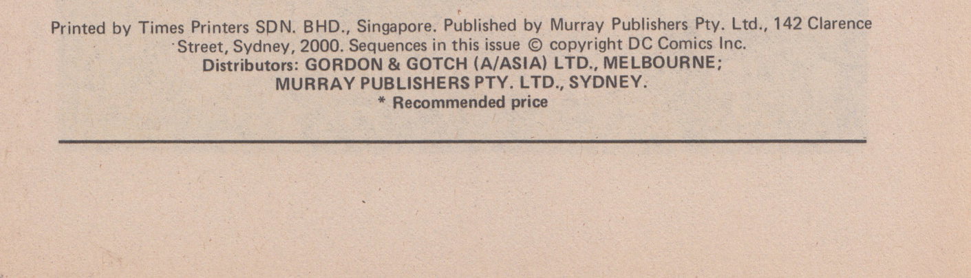 Printed by Times Printers SDN. BHD., Singapore. Published by Murray Publishers Pty. Ltd., 142 Clarence Street, Sydney, 2000. Sequences in this issue © copyright DC Comics Inc. Distributors: Gordon & Gotch (A/asia) Ltd., Melbourne; Murray Publishers Pty. Ltd., Sydney.