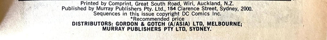 Printed by Comprint, Great South Road, Wiri, Auckland, N.Z. Published by Murray Publishers Pty. Ltd., 154 Clarence Street, Sydney, 2000. Sequences in this issue copyright DC Comics Inc. Distributors: Gordon & Gotch (A/asia) Ltd, Melbourne; Murray Publishers Pty Ltd, Sydney.