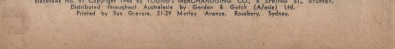 Blackhawk No. 97. Copyright 1948 by Young's Merchandising Co., 8 Spring Street, Sydney. Distributed throughout Australasia by Gordon & Gotch (A/asia) Ltd. Printed by Sun Gravure, 21-29 Morely Avenue, Rosebery, Sydney.