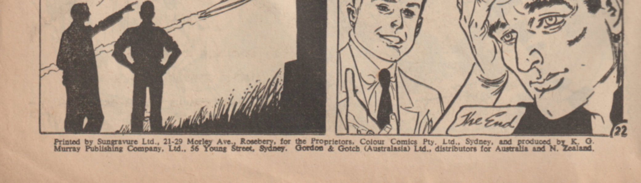 Printed by Sungravure Ltd., 21-29 Morley Ave., Rosebery, for the Proprietors, Colour Comics Pty. Ltd., Sydney, and produced by K. G. Murray Publishing Company, Ltd., 56 Young Street, Sydney. Gordon & Gotch (Australasia) Ltd., distributors for Australia and N. Zealand.