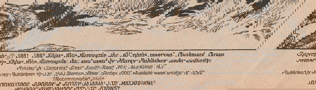 Copyright © 1981, 1982 Edgar Rice Burroughs, Inc. All rights reserved. Trademark Tarzan owned by Edgar Rice Burroughs, Inc. and used by Murray Publishers under authority. Printed by Momprint, Great South Road, Wiri, Auckland, N.Z. Published by Murray Publishers Pty. Ltd, 154 Clarence Street, Sydney 2000. Available week ending 15.10.82. Distributors: Gordon & Gotch (A/asia) Ltd, Melbourne; Murray Publishers Pty Ltd, Sydney.