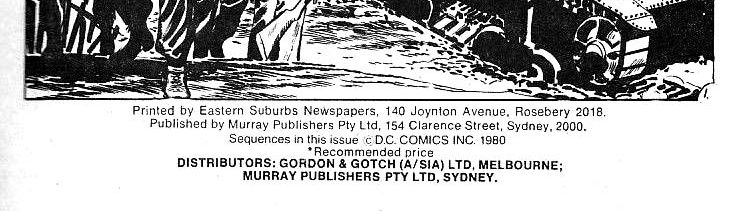 Printed by Eastern Suburbs Newspapers, 140 Joynton Avenue, Rosebery 2018. Published by Murray Publishers Pty Ltd, 154 Clarence Street, Sydney, 2000. Sequences in this issue © D.C. Comics Inc. 1980. Distributors: Gordon & Gotch (A/sia) Ltd, Melbourne; Murray Publishers Pty Ltd, Sydney.