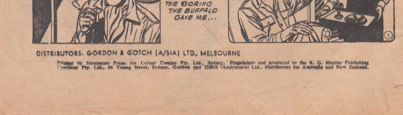 Printed by Mentmore Press, for Colour Comics Pty. Ltd., Sydney, Proprietors and produced by the K. G. Murray Publishing Company Pty. Ltd., 56 Young Street, Sydney. Gordon and Gotch (Australasia) Ltd., distributors for Australia and New Zealand.