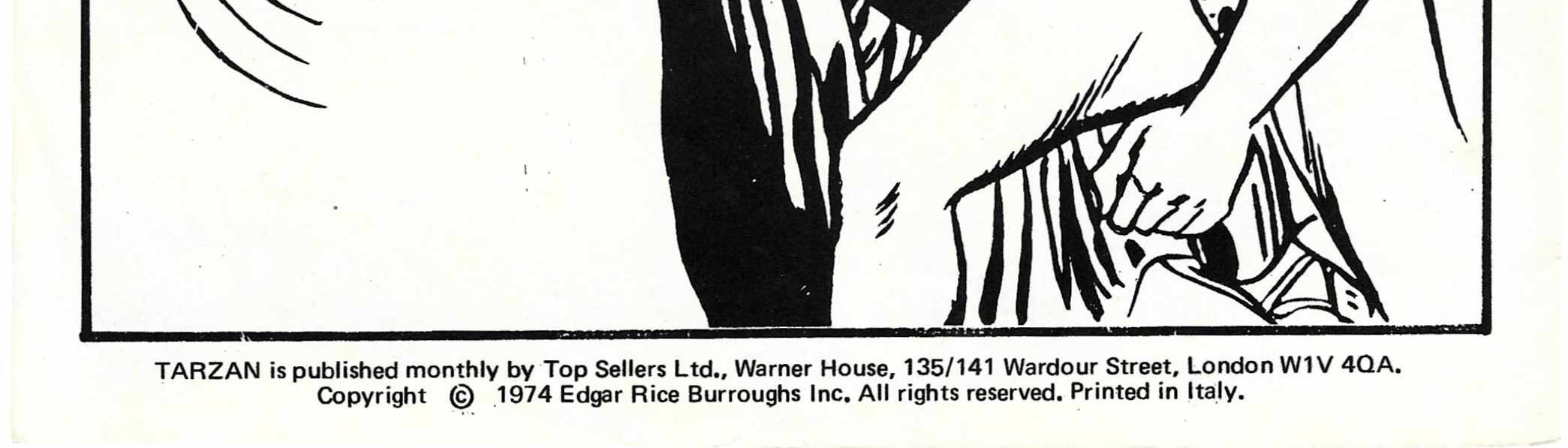 Tarzan is published monthly by Top Sellers Ltd., Warner House, 135/141 Wardour Street, London W1V 4QA. Copyright © 1974 Edgar Rice Burroughs Inc. All rights reserved. Printed in Italy.