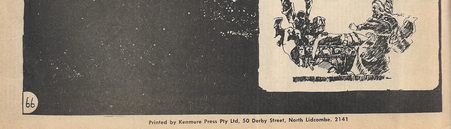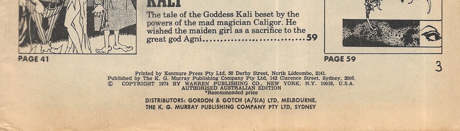 [Front] Printed by Kenmure Press Pty Ltd, 50 Derby Street, North Lidcombe, 2141. Published by The K. G. Murray Publishing Company Pty Ltd, 142 Clarence Street, Sydney, 2000. © Copyright 1974 by Warren Publishing Co., New york, N.Y. 10016, U.S.A. Authorised Australian Edition. Distributors: Gordon & Gotch (A/sia) Ltd, Melbourne, The K. G. Murray Publishing Company Pty Ltd, Sydney. [Back] Printed by Kenmure Press Pty Ltd, 50 Derby Street, North Lidcombe, 2141.