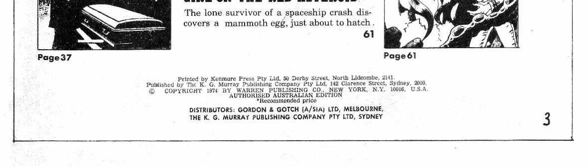 Printed by Kenmure Press Pty Ltd, 50 Derby Street, North Lidcombe, 2141. Published by The K. G. Murray Publishing Company Pty Ltd, 142 Clarence Street, Sydney, 2000. © Copyright 1974 by Warren Publishing Co., New York, N.Y. 10016, U.S.A. Authorised Australian Edition. Distributors: Gordon & Gotch (A/sia) Ltd, Melbourne, The K. G. Murray Publishing Company Pty Ltd, Sydney.