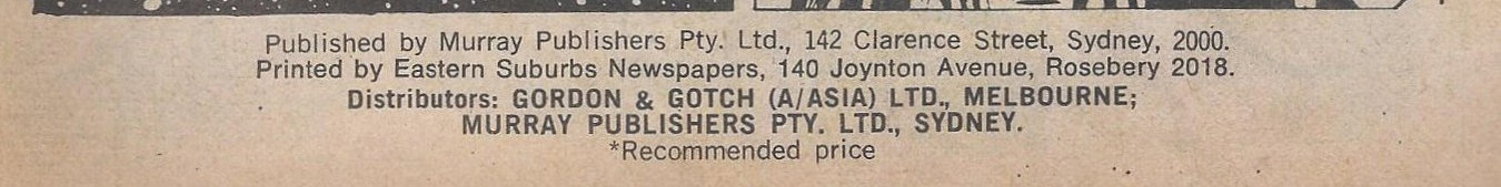 Published by Murray Publishers Pty. Ltd., 142 Clarence Street, Sydney, 2000. Printed by Eastern Suburbs Newspapers, 140 Joynton Avenue, Rosebery 2018. Distributors: Gordon & Gotch (A/asia) Ltd., Melbourne; Murray Publishers Pty. Ltd., Sydney.