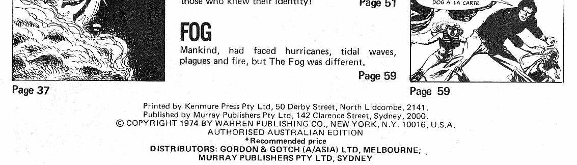 Printed by Kenmure Press Pty Ltd, 50 Derby Street, North Lidcombe, 2141. Published by Murray Publishers Pty Ltd, 142 Clarence Street, Sydney, 2000. © Copyright 1974 by Warren Publishing Co., New York, N.Y. 10016, U.S.A. Authorised Australian Edition.Distributors: Gordon & Gotch (A/asia) Ltd, melbourne; Murray Publishers Pty Ltd, Sydney.