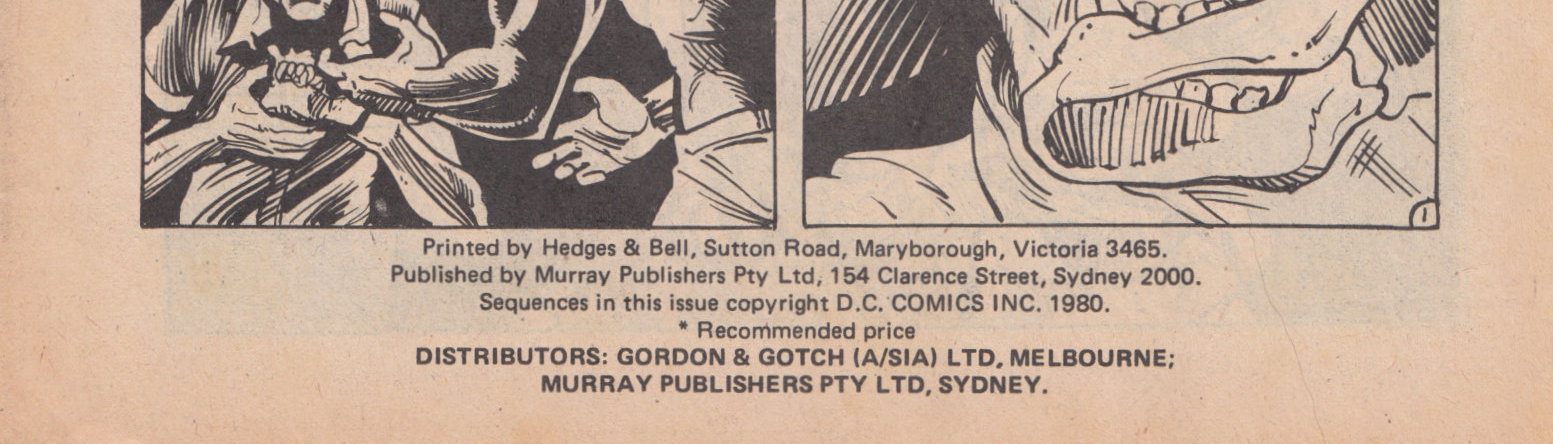 Printed by Hedges & Bell, Sutton Road, Maryborough, Victoria 3465. Published by Murray Publishers Pty Ltd, 154 Clarence Street, Sydney 2000. Sequences in this issue copyright D.C. Comics Inc. 1980. Distributors: Gordon & Gotch (A/sia) Ltd, Melbourne; Murray Publishers Pty Ltd, Sydney.