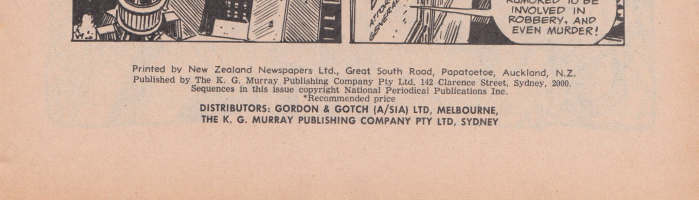 Printed by New Zealand Newspapers Ltd., Great South road, Papatoetoe, Auckland, N.Z. Published by The K. G. Murray Publishing Company Pty Ltd, 142 Clarence Street, Sydney, 2000. Sequences in this issue copyright National Periodical Publications Inc. Distributors: Gordon & Gotch (A/sia) Ltd, Melbourne, The K. G. Murray Publishing Company Pty Ltd, Sydney.