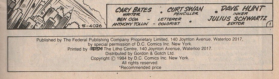Published by The Federal Publishing Company Proprietary Limited, 140 Joynton Avenue, Waterloo 2017, by special permission of D.C. Comics Inc. New York. Printed by ESN The Litho Centre, 140 Joynton Avenue, Waterloo 2017. Distributed by Grodon & Gotch Ltd. Copyright © 1984 by D.C. Comics Inc. New York.