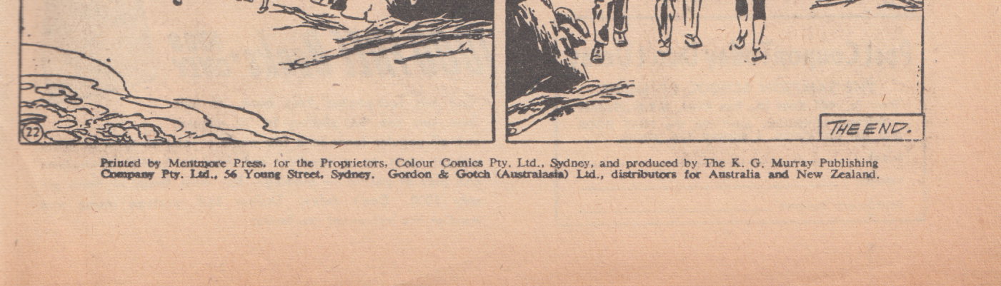 Printed by Mentmore Press, for the Proprietors, Colour Comics Pty. Ltd., Sydney, and produced by The K. G. Murray Publishing Company Pty. Ltd., 56 Young Street, Sydney. Gordon & Gotch (Australasia) Ltd., distributors for Australia and New Zealand.