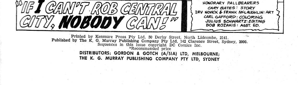 Printed by Kenmure Press Pty Ltd, 50 Derby Street, North Lidcombe, 2141. Published by The K. G. Murray Publishing Company Pty Ltd, 142 Clarence Street, Sydney, 2000. Sequences in this issue copyright DC Comics Inc. Distributors: Gordon & Gotch (A/sia) Ltd, Melbourne; The K. G. Murray Publishign Company Pty Ltd, Sydney.