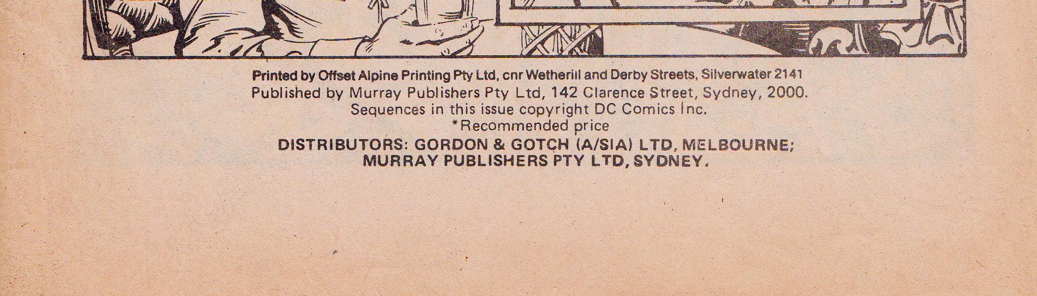 Printed by Offset Alpine Printing Pty Ltd, cnr Wetherill and Derby Streets, Silverwater 2141. Published by Murray Publishers Pty Ltd, 142 Clarence Street, Sydney, 2000. Sequences in this issue copyright DC Comics Inc. Distributors: Gordon & Gotch (A/sia) Ltd, Melbourne; Murray Publishers Pty Ltd, Sydney.