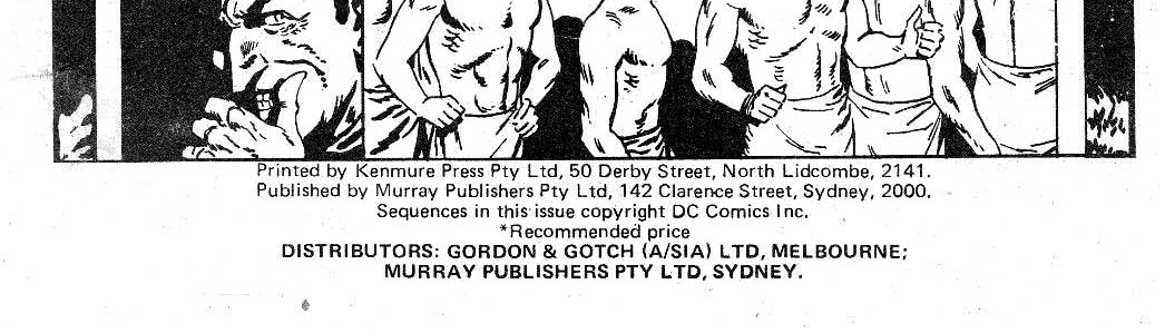 Printed by Kenmure Press Pty Ltd, 50 Derby Street, North Lidcombe, 2141. Publihsed by Murray Publishers Pty ltd, 142 Clarence street, Sydney, 2000. Sequences in this issue copyright DC Comics inc. Distributors: Gordon & Gotch (A/sia) Ltd, Melbourne; Murray Publishers Pty Ltd, Sydney.