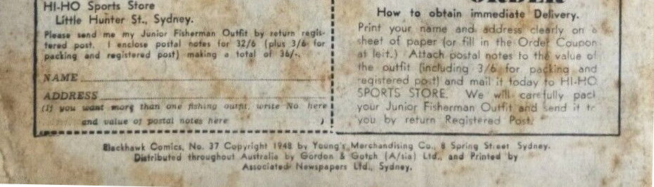 Blackhawk Comics, No. 37. Copyright 1948 by Young's Merchandising Co., 8 Spring Street, Sydney. Distributed throughout Australia by Gordon & Gotch (A/sia) Ltd., and printed by Associated Newspapers Ltd., Sydney.