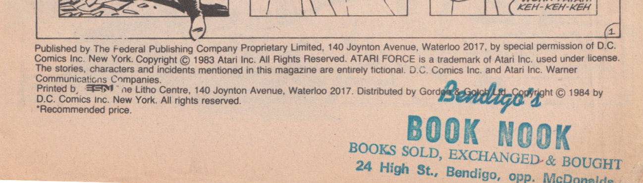 Published by The Federal Publishing Company Proprietary Limited, 140 Joynton Avenue, Waterloo 2017, by special permission of D.C. Comics Inc. New York. Copyright © 1983 Atari Inc. All rights Reserved. Atari Force is a trademark of Atari Inc. used under license. The stories, characters and incidents mentioned in this magazine are entirely fictional. D.C. Comics Inc. and Atari Inc. Warner Communications Companies. Printed by ESN The Litho Centre, 140 Joynton Avenue, Waterloo 2017. Distributed by Gordon & Gotch Ltd. Copyright © 1984 by D.C. Comics Inc. New York. All rights reserved.