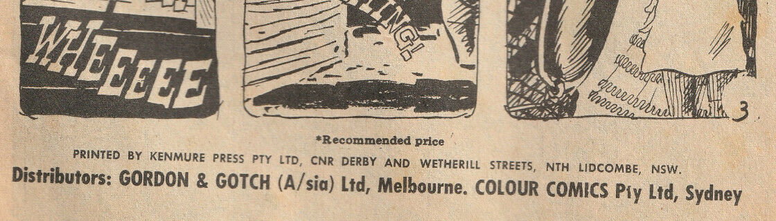 Printed by Kenmure Press Pty Ltd, Cnr Derby and Wetherill Streets Nth Lidcombe, NSW, for the Proprietors Colour Comics Pty Ltd, Sydney, and produced by The K. G. Murray Publishing Company Pty Ltd, 142 Clarence Street, Sydney. Gordon & Gotch (A/sia) Ltd, distributors for Australia and New Zealand. Sequences in this issue Copyright National Periodical Publications Inc.