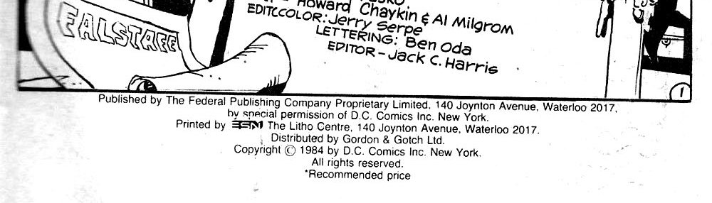 Published by The Federal Publishing Company Proprietary Limited, 140 Joynton Avenue, Waterloo 2017, by special permission of D.C. Comics Inc. New York. Printed by ESN The Litho Centre, 140 Joynton Avenue, Waterloo 2017. Distributed by Gordon & Gotch Ltd. Copyrignt © 1984 by D.C. Comics Inc. New York. All rights reserved.