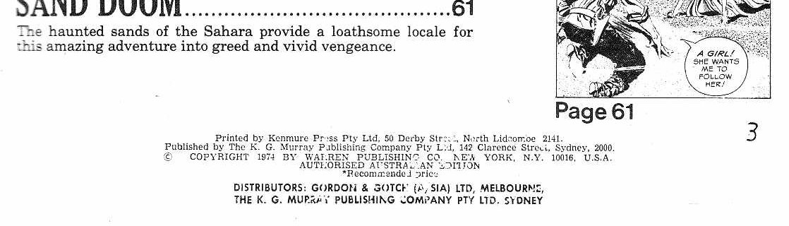 Printed by Kenmure Press Pty Ltd, 50 Derby Street, North Lidcombe, 2141. Published by The K. G. Murray Publishing Company Pty Ltd, 142 Clarence Street, Sydney, 2000. © Copyright 1974 by Warren Publishing Co., New York, N.Y. 10016, U.S.A. Distributors: Gordon & Gotch (A/sia) Ltd, Melbourne, The K. G. Murray Publishing Company Pty Ltd, Sydney.