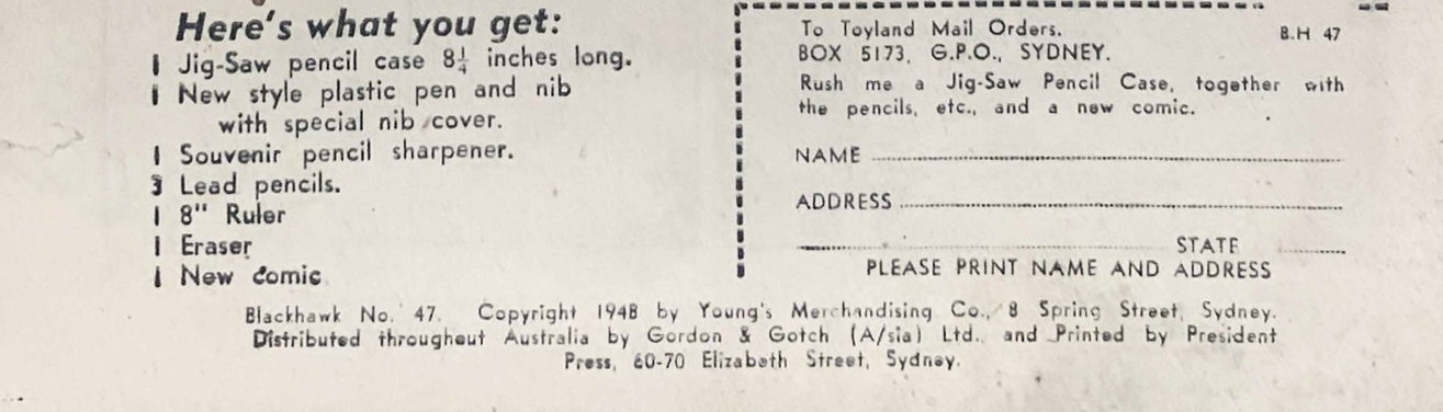 Blackhawk No. 47. Copyright 1948 by Young's Merchandising Co., 8 Spring Street, Sydney. Distributed throughout Australia by Gordon & Gotch (A/sia) Ltd., and printed by President Press, 60-70 Elizabeth Street, Sydney.