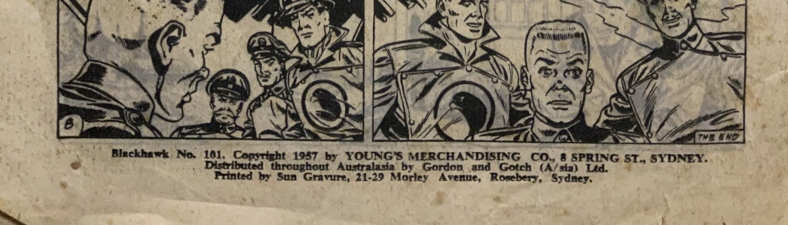Blackhawk No. 101. Copyright 1957 by Young's Merchandising Co., 8 Spring St., Sydney. Distributed throughout Australasia by Gordon and Gotch (A/sia) Ltd. Printed by Sun Gravure, 21-29 Morley Avenue, Rosebery, Sydney.