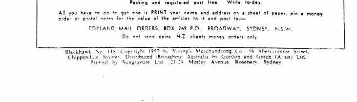 Blackhawk No. 118. Copyright 1957 by Young's Merchandising Co., 56 Abercrombie Street, Chippendale, Sydney. Distributed throughout Australia by Gordon and Gotch (A/sia) Ltd. Printed by Sungravure Ltd., 21-29 Morley Avenue, Rosebery, Sydney.