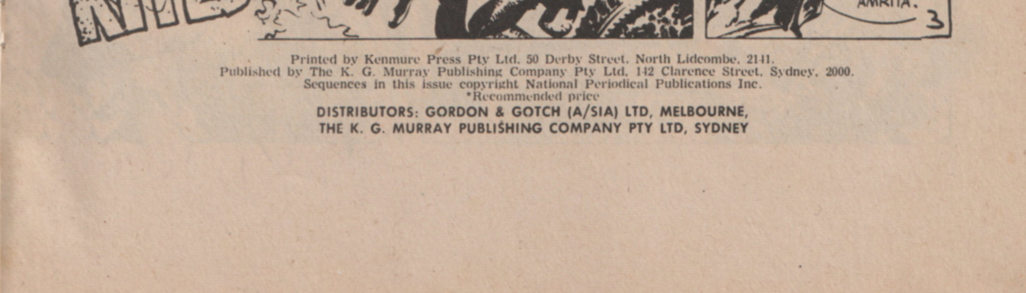 Printed by Kenmure Press Pty Ltd, 50 Derby Street, North Lidcombe, 2141. Published by The K. G. Murray Publishing Company Pty Ltd, 142 Clarence Street, Sydney, 2000. Sequences in this issue copyright National Periodical Publications Inc. Distributors: Gordon & Gotch (A/sia) Ltd, Melbourne, The K. G. Murray Publishing Company Pty Ltd, Sydney.