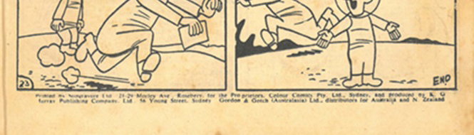 Printed by Sungravure Ltd, 21-29 Morley Ave, Rosebery, for the Proprietors, Colour Comics Pty Ltd, Sydney, and produced by the KG Murray Publishing Company Pty Ltd, 56 Young Street, Sydney. Gordon & Gotch (Australasia) Ltd, distributors for Australia and N. Zealand.