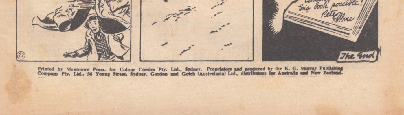 Printed by Mentmore Press, for Colour Comics Pty. Ltd., Sydney. Proprietors and produced by the K. G. Murray Publishing Company Pty. Ltd., 56 Young Street, Sydney. Gordon and Gotch (Australasia) Ltd., distributors for Australia and New Zealand.