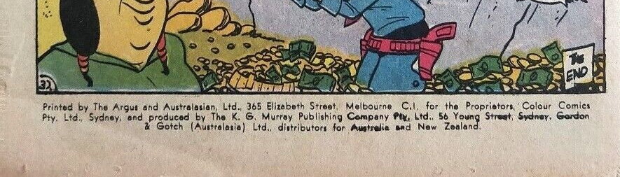 Printed by The Argus and Australasian, Ltd., 365 Elizabeth Street, Melbourne C.1. for the Proprietors, Colour Comics Pty. Ltd., Sydney, and produced by The K.G. Murray Publishing Company Pty. Ltd., 56 Young Street, Sydney. Gordon & Gotch (Australiasia) Ltd., distributors for Australia and New Zealand.