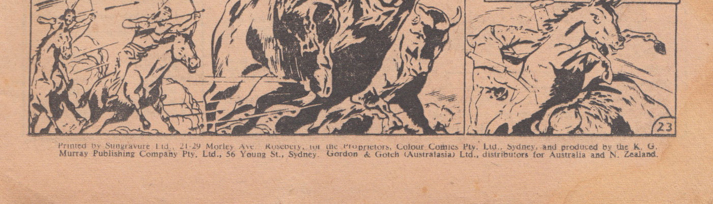 Printed by Sungravure Ltd., 21-29 Morley Ave., Rosebery, for the Proprietors, Colour Comics Pty. Ltd., Sydney, and produced by the K. G. Murray Publishing Company Pty. Ltd., 56 Young St., Sydney. Gordon & Gotch (Australasia) Ltd., distributors for Australia and N. Zealand.