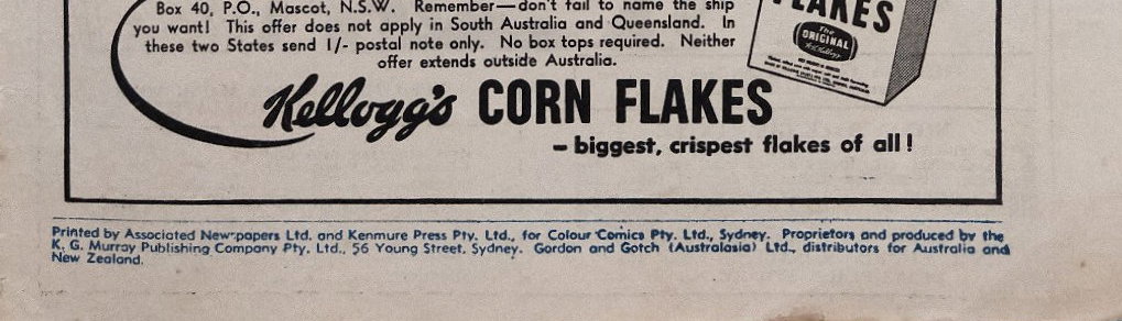 Printed by Associated Newspapers Ltd. And Kenmure Press Pty. Ltd., for Colour Comics Pty. Ltd., Sydney. Proprietors and produced by the K. G. Murray Publishing Company Pty. Ltd., 56 Young Street, Sydney. Gordon and Gotch (Australasia) Ltd., distributors for Australia and New Zealand.