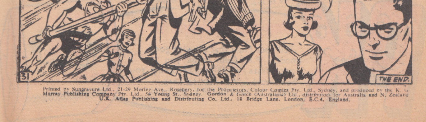 Printed by Sungravure Ltd., 21-29 Moreley Ave., Rosebery, for the Proprietors, Colour Comics Pty. Ltd., Sydney, and produced by the K. G. Murray Publishing Company Pty. Ltd., 56 Young St., Sydney. Gordon & Gotch (Australasia) Ltd., distributors for Australia and N. Zealand. U.K. Atlas Publishing and Distributing Co. Ltd., 18 Bridge Lane, London, E.C.4. England.