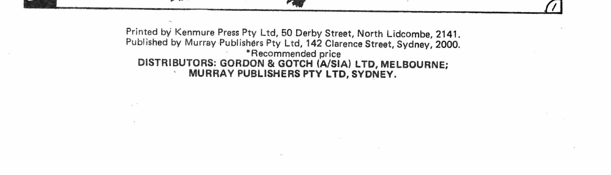 Printed by Kenmure Press Pty Ltd 50 Derby Street, North Lidcombe, 2141. Published by Murray Publishers Pty Ltd, 142 Clarence Street, Sydney, 2000. Distributors: Gordon & Gotch (A/sia) Ltd, Melboune; Murray Publishers Pty Ltd, Sydney.