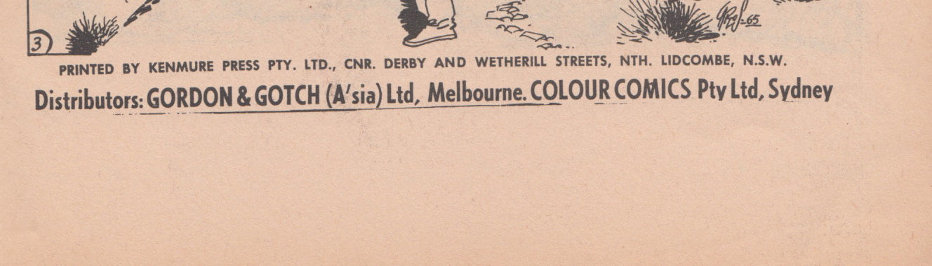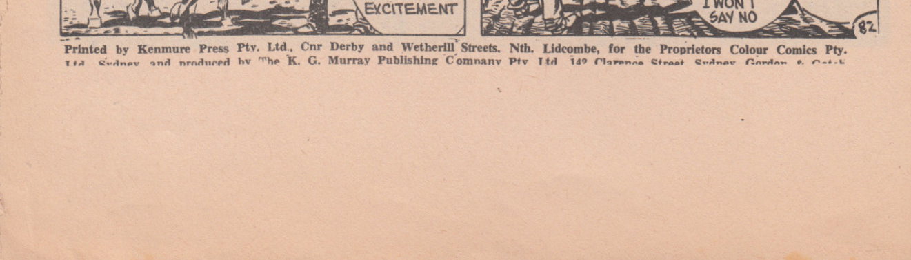 Printed by Kenmure Press Pty. Ltd., Cnr Derby and Wetherill Streets, Nth. Lidcombe, for the Proprietors Colour Comics Pty. Ltd., Sydney and produced by The K. G. Murray Publishing Company Pty. Ltd., 149 Clarence Street, Sydney, Gordon & Gotch [remaining indicia not printed on the catalogued copy.]