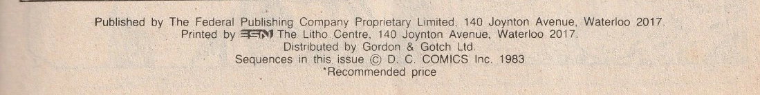 Printed by The Federal Publishing Company Proprietary Limited, 140 Joynton Avenue, Waterloo 2017. Printed by ESN The Litho Centre, 140 Joynton Avenue, Waterloo 2017. Distributed by Gordon & Gotch Ltd. Sequences in this issue © D. C. Comics 1983.