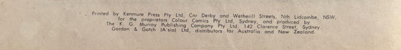 Printed by Kenmure Press Pty. Ltd., Cnr Derby and Wetherill Streets, Nth Lidcombe, for the proprietors Colour Comics Pty. Ltd., Sydney, and produced by The K. G. Murray Publishing Company Pty. Ltd., 142 Clarence Street, Sydney. Gordon & Gotch (A/sia) Ltd., distributors for Australia and New Zealand.