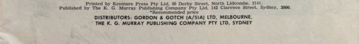 Printed by Kenmure Press Pty. Ltd., Cnr Derby and Wetherill Streets, Nth Lidcombe, for the proprietors Colour Comics Pty. Ltd., Sydney, and produced by The K. G. Murray Publishing Company Pty. Ltd., 142 Clarence Street, Sydney. Gordon & Gotch (A/sia) Ltd., distributors for Australia and New Zealand.