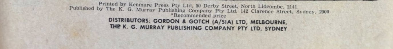 Printed by Kenmure Press Pty Ltd, 50 Derby Street, North Lidcombe, 2141. Published by The K. G. Murray Publishing Company Pty Ltd, 142 Clarence Street, Sydney, 2000. Distributors: Gordon & Gotch (A/sia) Ltd, Melbourne, The K. G. Murray Publishing Company Pty Ltd, Sydney.