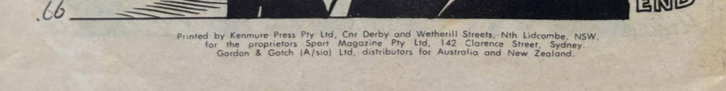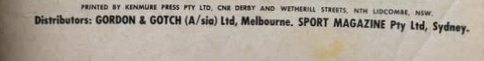 Printed by Kenmure Press Pty Ltd, Cnr Derby and Wetherill Streets, Nth Lidcombe, NSW, for the proprietors Sport Magazine Pty Ltd, 142 Clarence Street, Sdyney. Gordon & Gotch (A/sia) Ltd, distributors for Australia and New Zealand.
