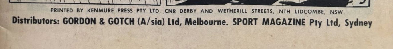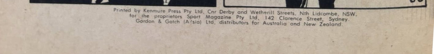 Printed by Kenmure Press Pty Ltd, Cnr Derby and Wetherill Streets, Nth Lidcombe, NSW, for the proprietors Sport Magazine Pty. Ltd, 142 Clarence Street, Sydney. Gordon & Gotch (A'sia) Ltd, distributors for Australia and New Zealand.