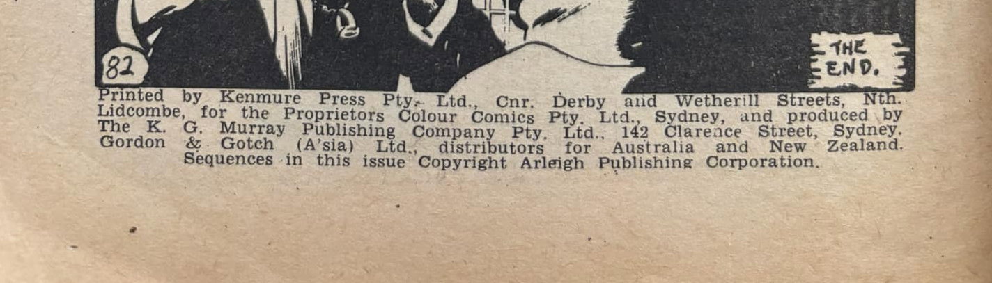 Printed by Kenmure Press Pty. Ltd., Cnr. Derby and Wetherill Streets, Nth. Lidcombe, for the Proprietors Colour Comics Pty. Ltd., Sydney, and produced by The K. G. Murray Publishing Company Pty. Ltd., 142 Clarence Street, Sydney. Gordon & gotch (A'sia) Ltd., distributors for Australia and New Zealand. Sequences in this issue Copyright Arleigh Publishing Corporation.