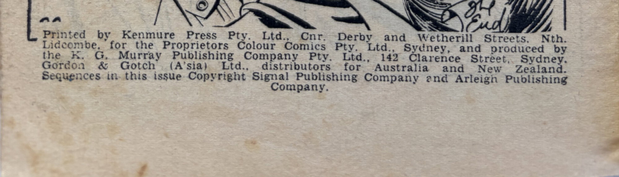 Printed by Kenmure Press Pty. Ltd., Cnr. Derby and Wetherill Streets, Nth. Lidcombe, for the Proprietors Colour Comics Pty. Ltd., Sydney, and produced by the K. G. Murray Publishing Company Pty. Ltd., 142 Clarence Street, Sydney, Gordon & Gotch (A'sia) Ltd., distributors for Australia and New Zealand. Sequences in this issue Copyright Signal Publishing Company and Arleigh Publishing Company.