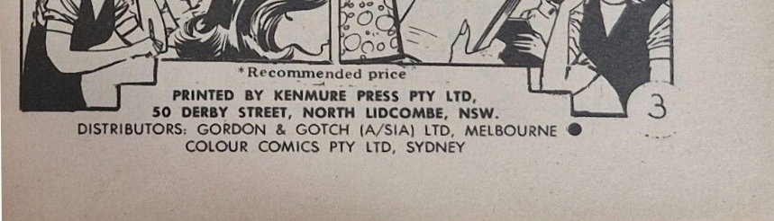 Printed by Kenmure Press Pty Ltd, cnr Derby and Wetherill Streets Nth Lidcombe, NSW, for the Proprietors Colour Comics Pty Ltd, Sydney, and produced by The K. G. Murray Publishing Company Pty Ltd, 142 Clarence Street, Sydney. Gordon & Gotch (A/sia) Ltd, distributors for Australia and New Zealand. Sequences in this issue Copyright National Periodical Publications Inc.