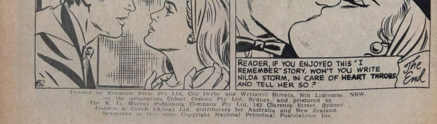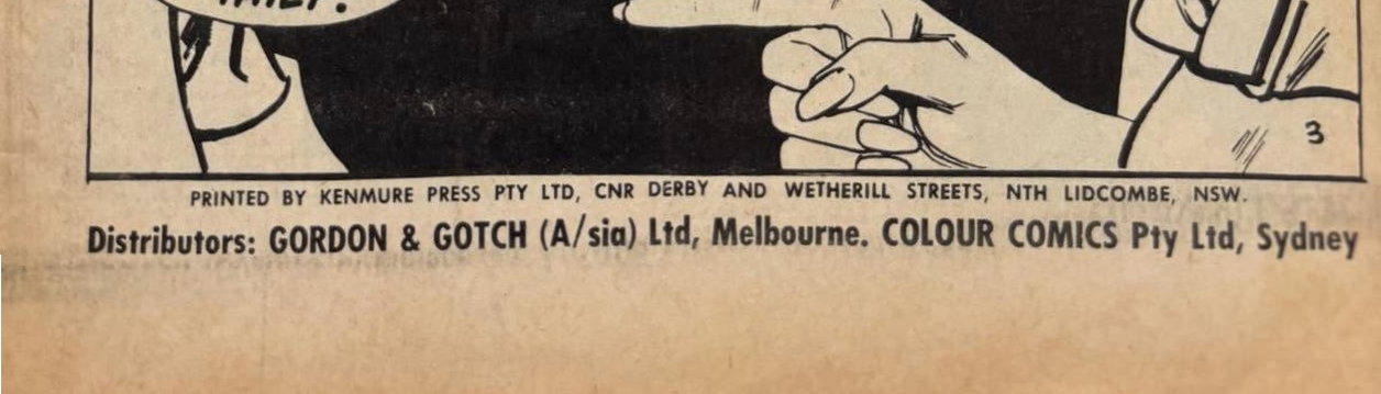 Printed by Kenmure Press Pty Ltd, Cnr Derby and Wetherill Streets, Nth Lidcombe, NSW, for the proprietors, Colour Comics Pty Ltd, Sydney, and produced by The K. G. Murray Publishing Company Pty Ltd, 142 Clarence Street, Sydney. Gordon & Gotch (A/sia) Ltd. Distributors for Australia and New Zealand. Sequences in this issue Copyright National Periodical Publications Inc.